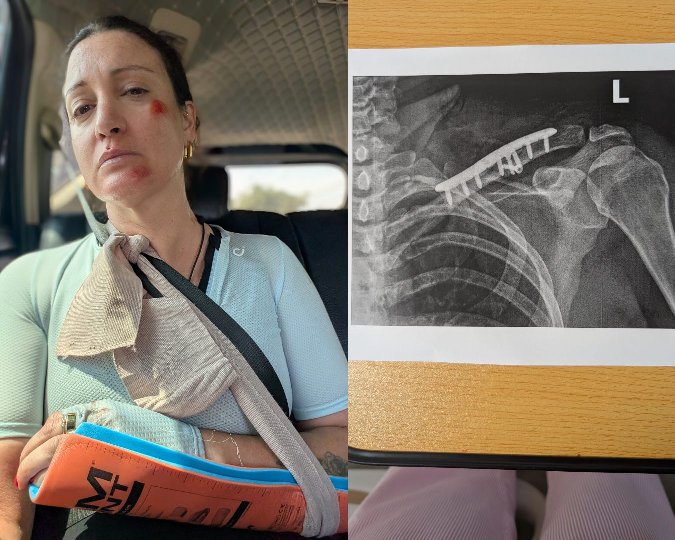 My collar bone was in two pieces, right in the middle. I fractured two ribs (luckily stable, so I could get into surgery quickly), have massive bruises on my medial L knee, medial R shin, all down my L hip, road rash on my L shoulder, face in several places, L knee and L ankle.